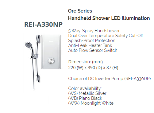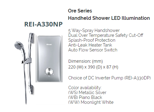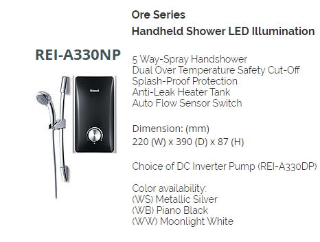 RINNAI REI-A330NP BLACK/WHITE/SILVER INSTANT WATER HEATER WITH HANDSHOWER SET