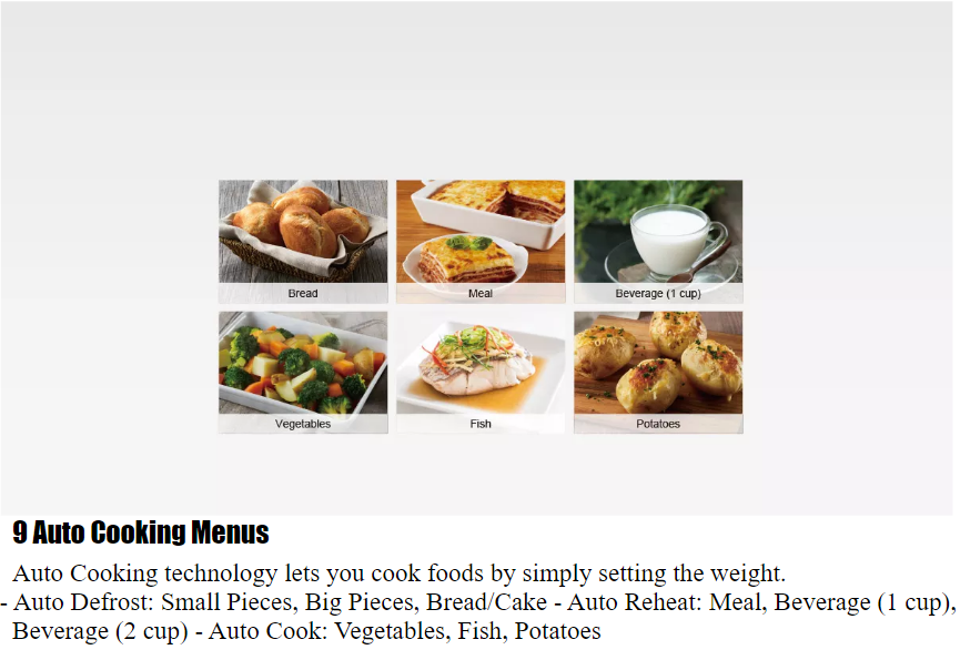 800W Cooking Power Quick 30 Function - Allows you to set cooking time for 30 seconds quickly and simply without selecting any additional settings Auto Cooking technology lets you cook foods by simply setting the weight - Auto Defrost - Auto Reheat - Auto Cook