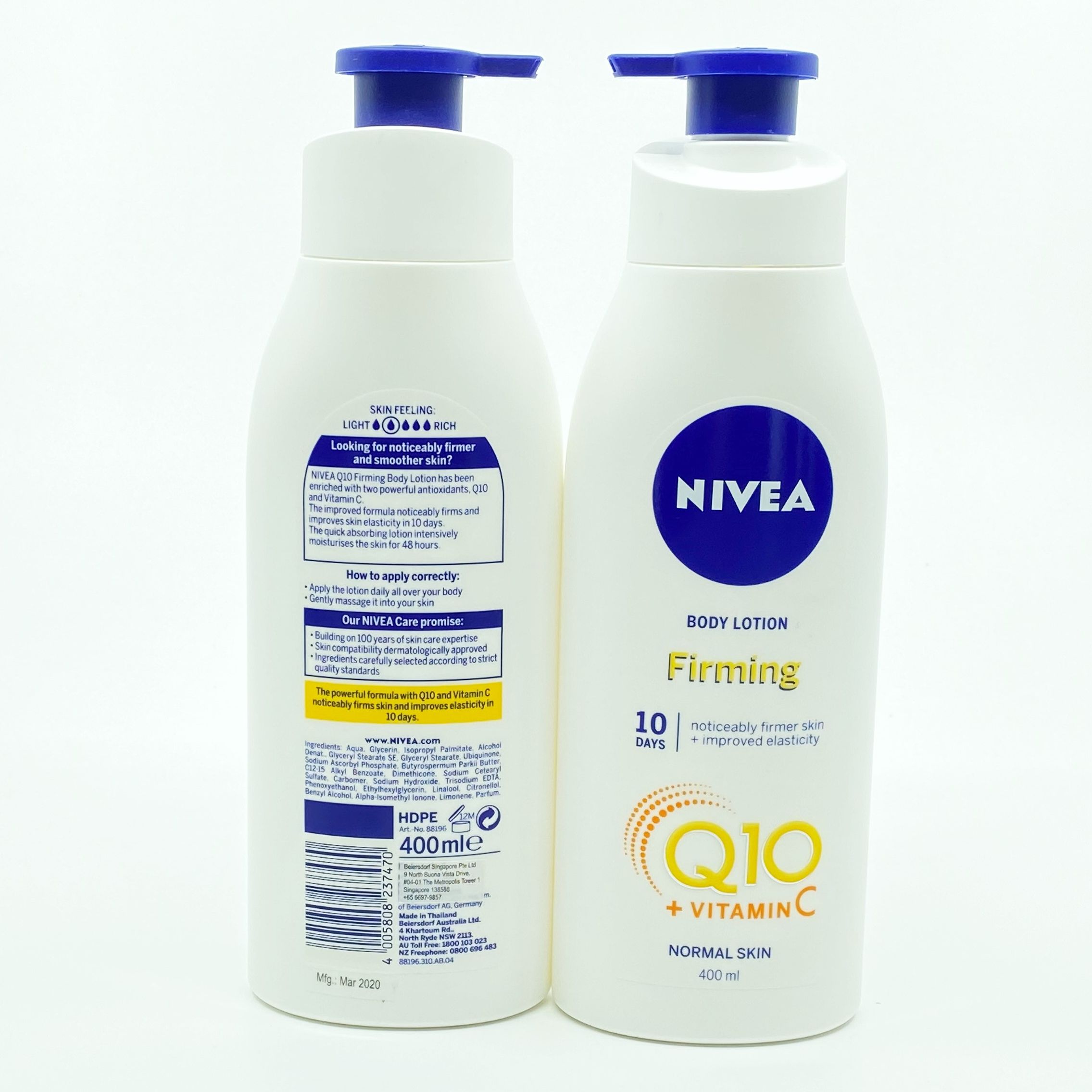 Nivea® Q10 Firming Body Lotion has been enriched with 2 powerful antioxidants, Q10 and Vitamin C. The improved formula noticeably firms and improves skin elasticity in 10 days. The quick absorbing lotion intensively moisturises the skin for 48 hours. Nivea® Q10 Firming Body Lotion provides a pleasant scent. Dermatologically approved.