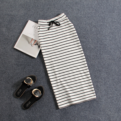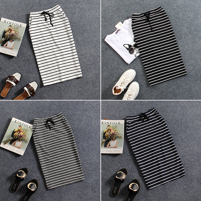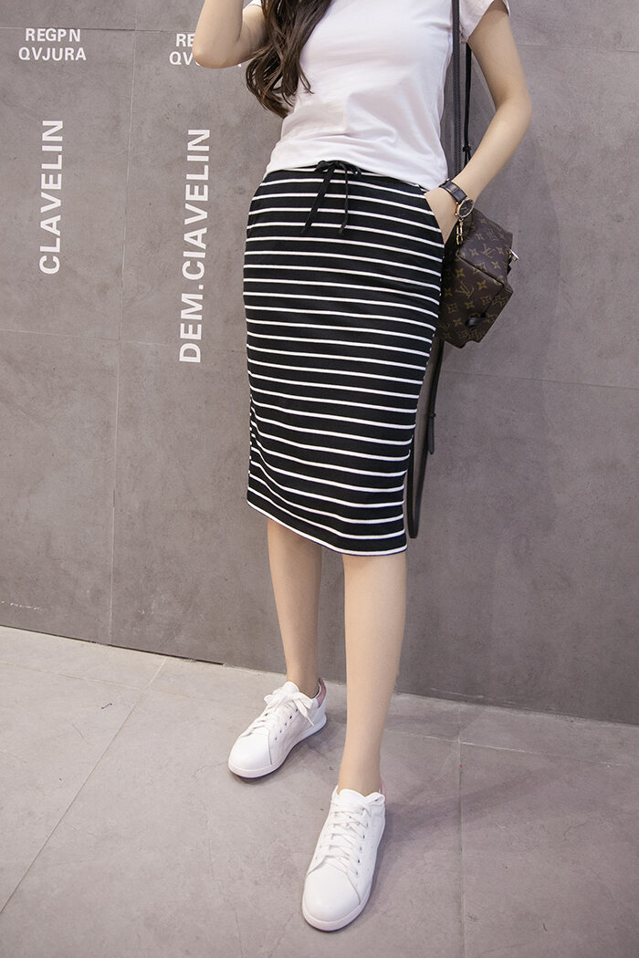2023 Korean Style Summer New Black and White Striped Casual Pocket Medium Long Sheath Pencil One-Step Skirt Skirt for Women