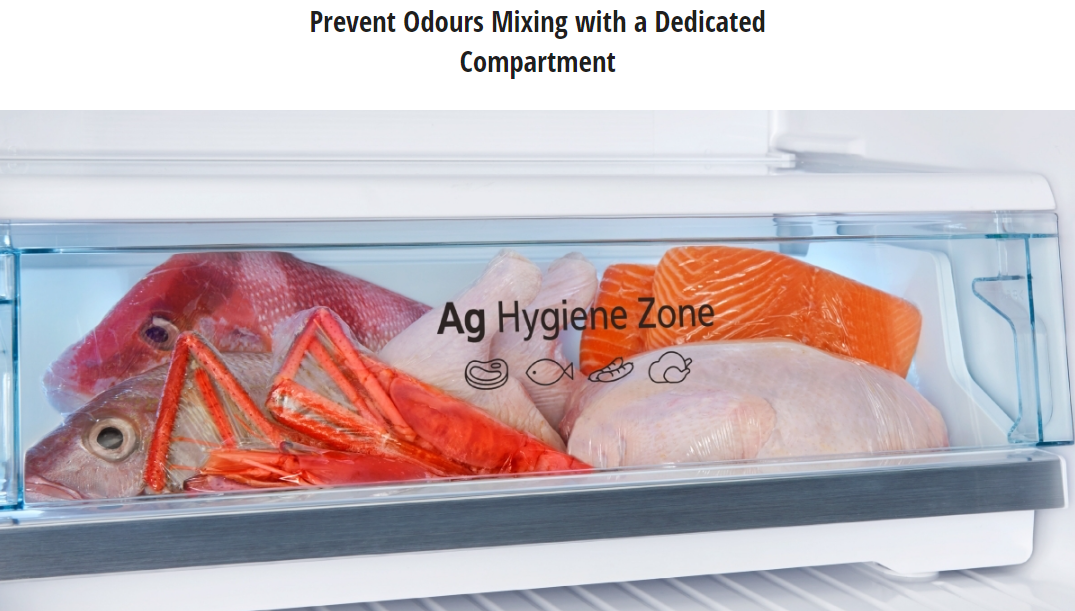The unique Ag Hygiene Zone design to store meat, fish and other strong-smelling items prevents the spread of odours for hygienic storage.