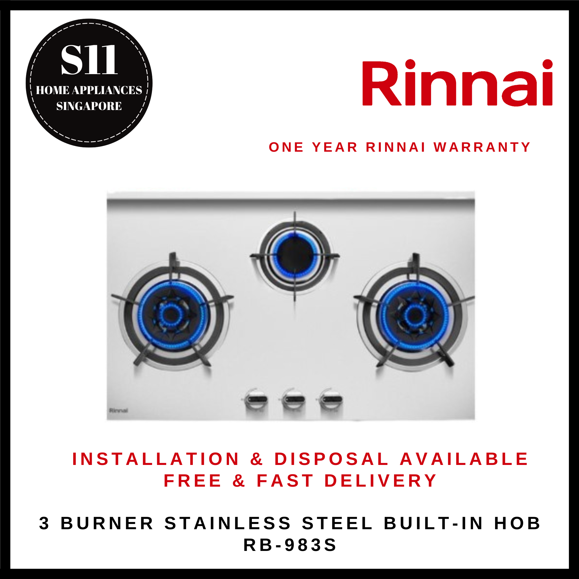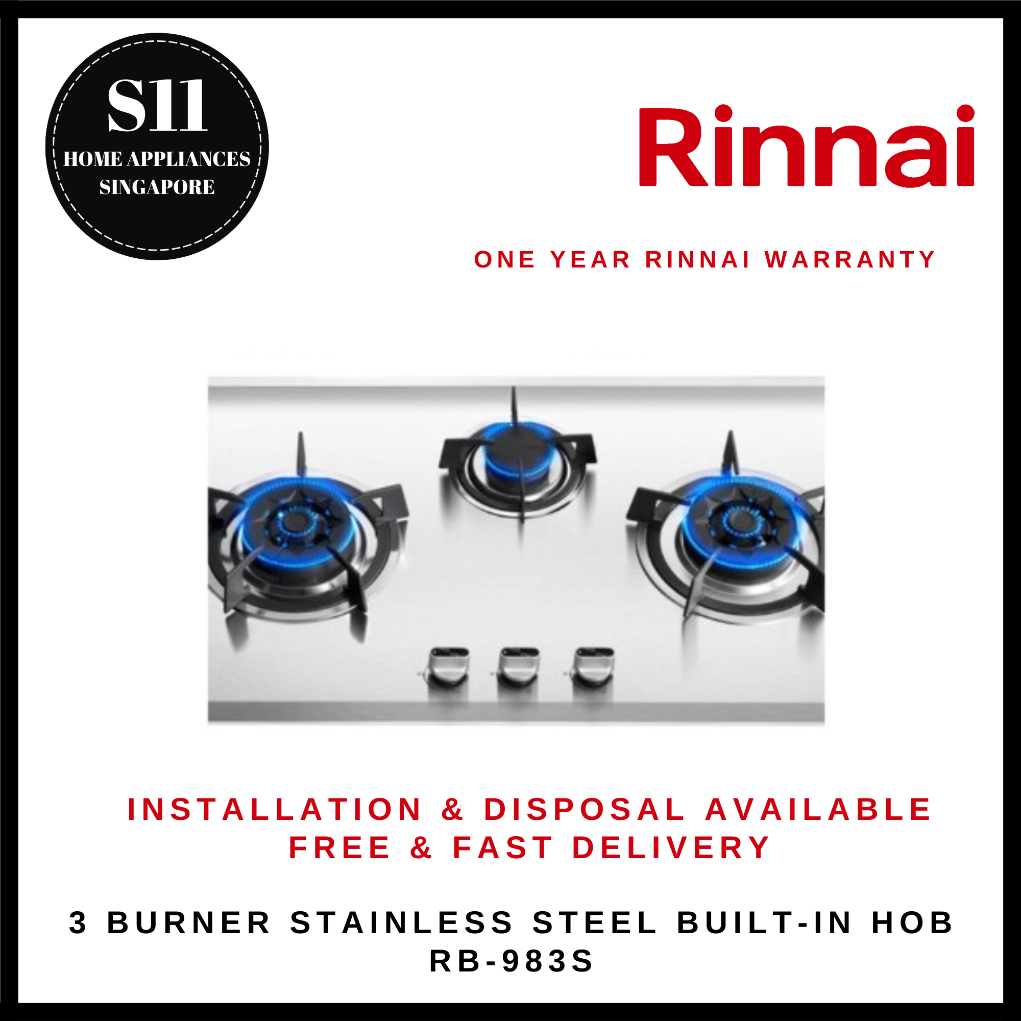 RINNAI RB-983S 3 BURNER STAINLESS STEEL BUILT-IN HOB - READY STOCKS & DELIVER IN 3 DAYS