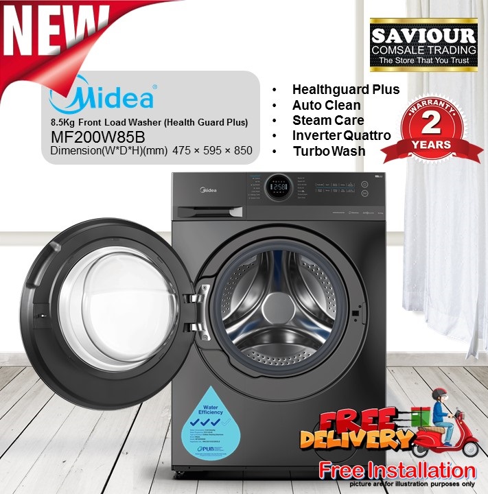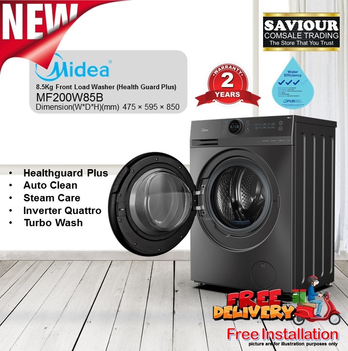 Midea MF200D85B 2 in 1 Combo Washer Dryer (8.5Kg Wash / 6Kg Dry) - Health Guard Plus - Auto Clean - Steam Care - Inverter Quattro - Turbo Wash Specifications : Washing Capacity (Kg) 8.5 Spinning Capacity (Kg) 6 Rated Power Supply (V) 220V~240V/50Hz Rated Frequency (Hz) 220V~240V/50Hz Rated Power (W) 1900 Max Spin Speed 1400 Spin speed 0-400-600-800-1000-1200-1400 Temperature Cold-20-30-40-60-90 The drying power 1300W Motor Inverter Quattro Color Dark Grey Core Selling Point BLDC check Steam Care check The antibacterial door Gasket check Programme Cotton check Cold Wash check Mix check Wool check ECO 40-60 check Quick 15′ check Allergy Care check Steam Care check Rinse & Spin check Spin Only check Wash & Dry check Auto Dry check Time Dry check Bulky check Dimensions Product Dimension(mm)(W*D*H) 595 x 475 x 850 Net weight(KG) 65 Gross weight(KG) 68 - Warranty - 10 years on Motor 2 years on Parts *Warranty does not cover Hose, Handle, Plug, Lock, Light & Accessories. 45 SIMS DRIVE #01-172 SINGAPORE 380045 MON-FRI ( 11AM-8PM) SAT (11AM-3PM) FEEL FREE TO CALL 8949 8082