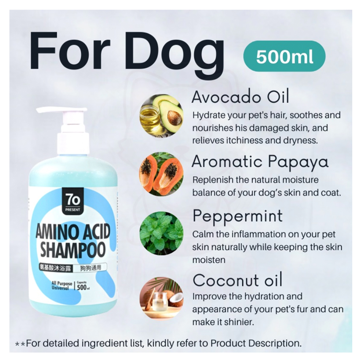 ⭐Our Dog Amino Acid Shampoo 500ml is a premium grooming solution designed to nourish your furry friend's coat while promoting overall skin health. Enriched with carefully selected amino acids and natural ingredients, this shampoo leaves your dog's coat clean, soft, and brilliantly shiny.