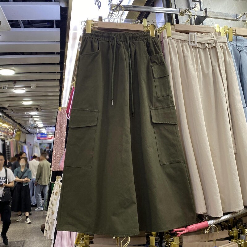 100.00kg Chubby Girl Summer K-style Women's Mid Length Long Length A- line Skirt Elastic Waist One Breasted Pocket plus Size Skirt