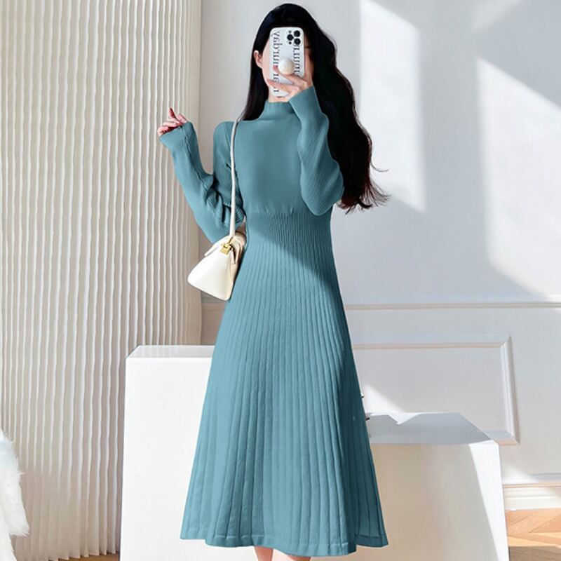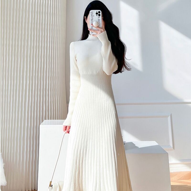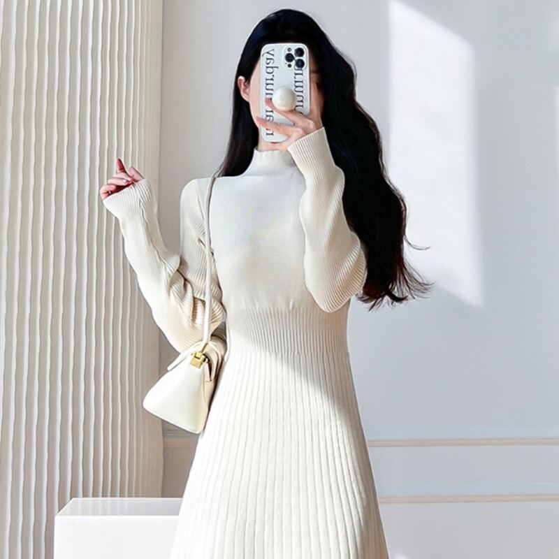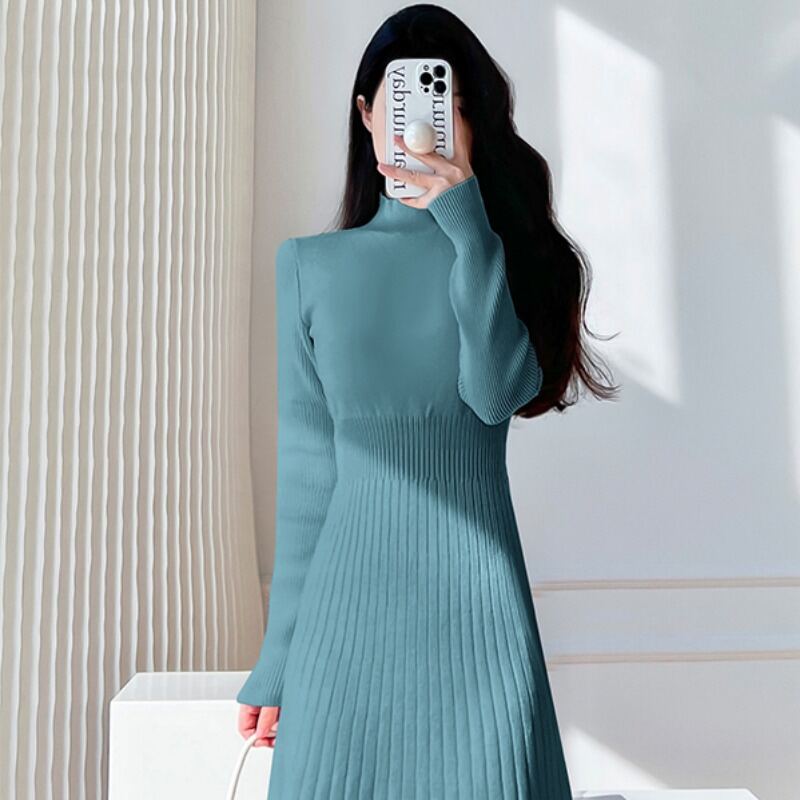 Fancy Half Turtleneck Knitted Long-Sleeved Dress Women's Autumn and Winter Coat Inner Wear Base Overknee Sweater Long Skirt