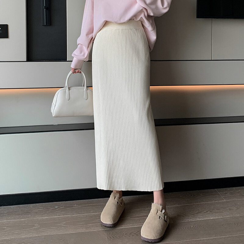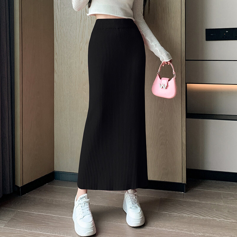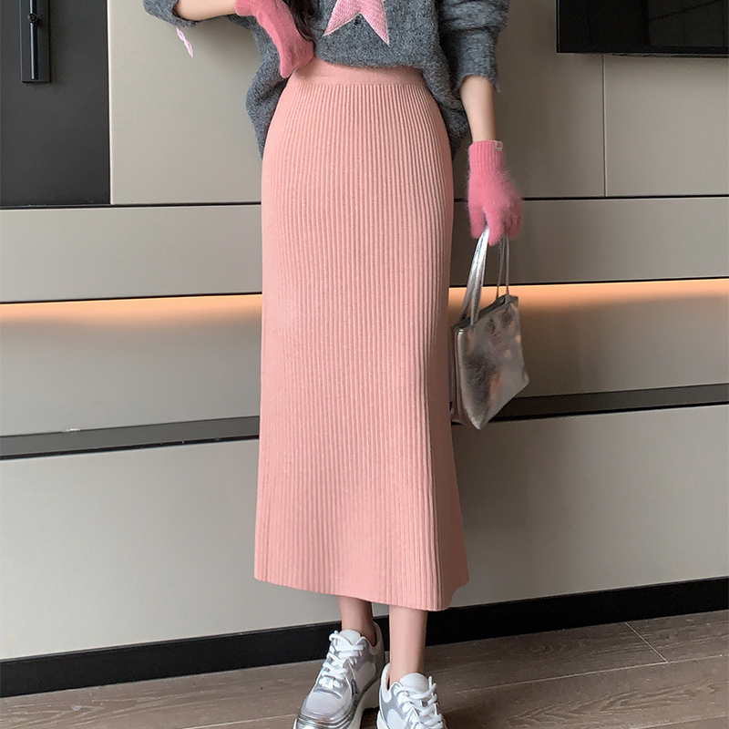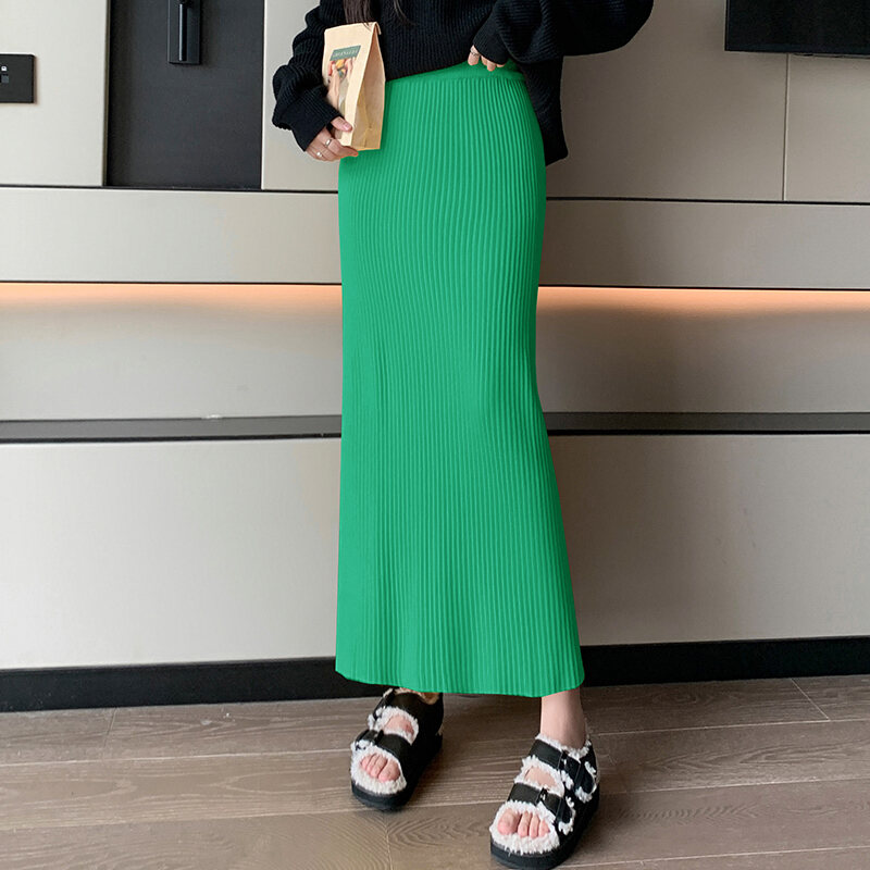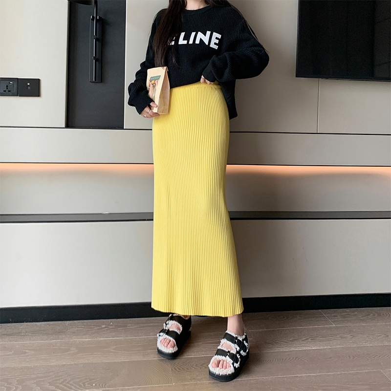 Candy Color Knitted Straight Sunken Stripe Mid Length Long Length Skirt