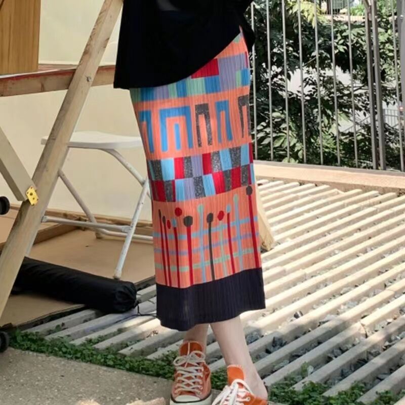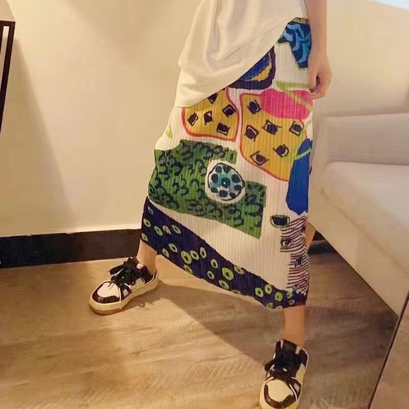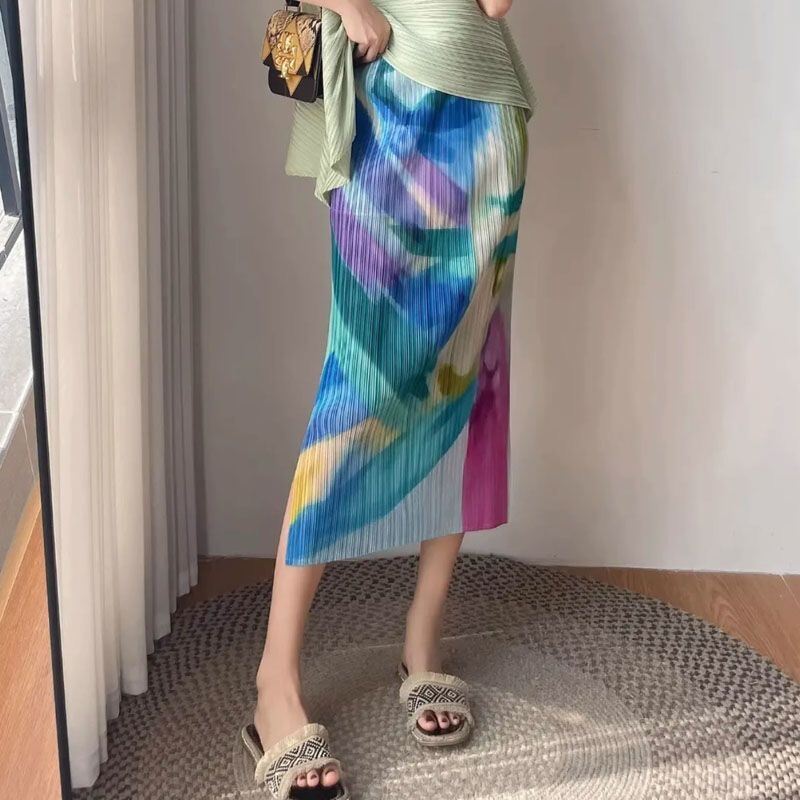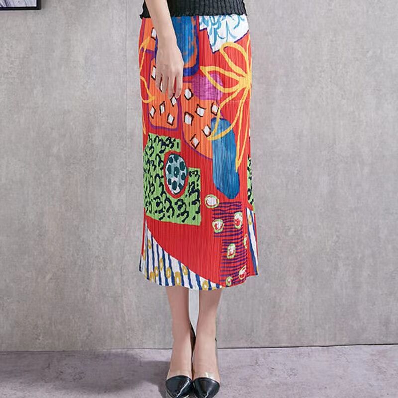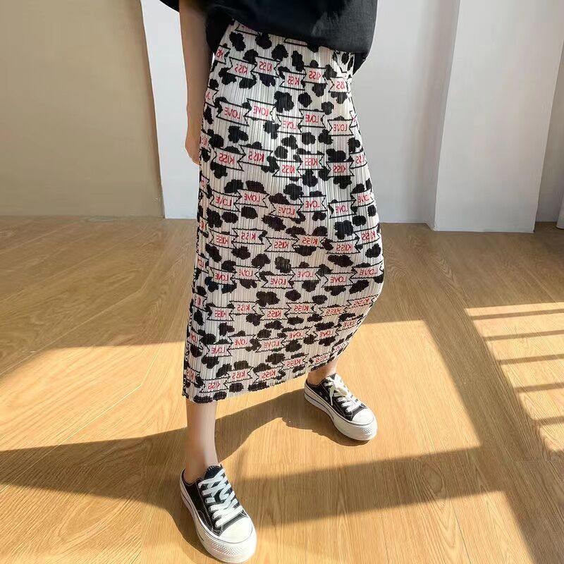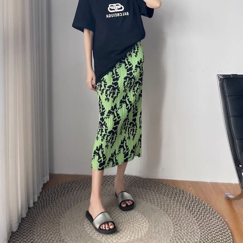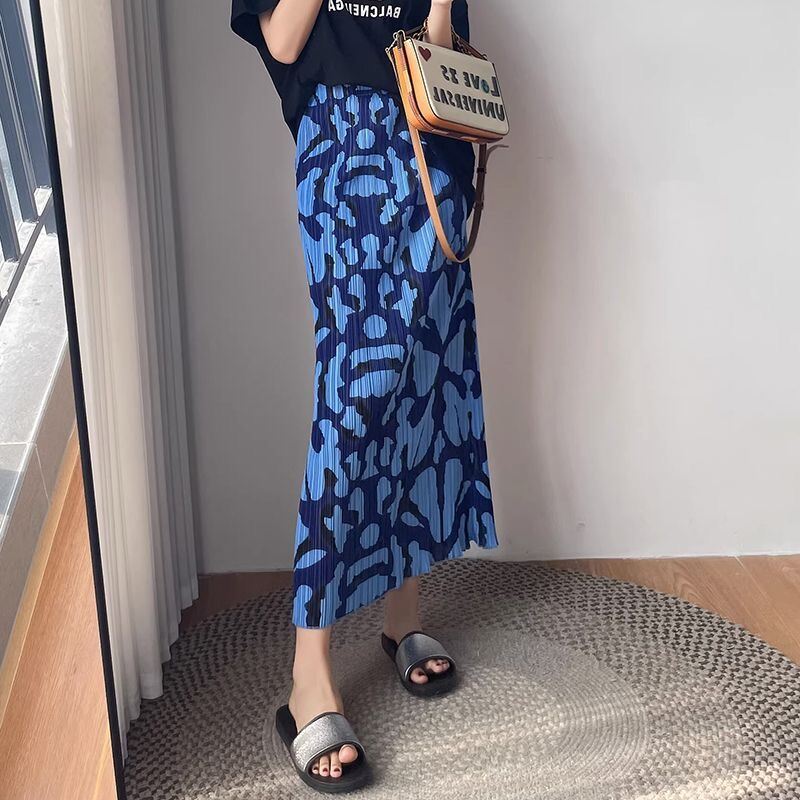 Pleated Skirt a-Line Slit Midi Skirt Women's Summer Thin High Waist Loose and Slimming Pleated Skirt Floral Skirt