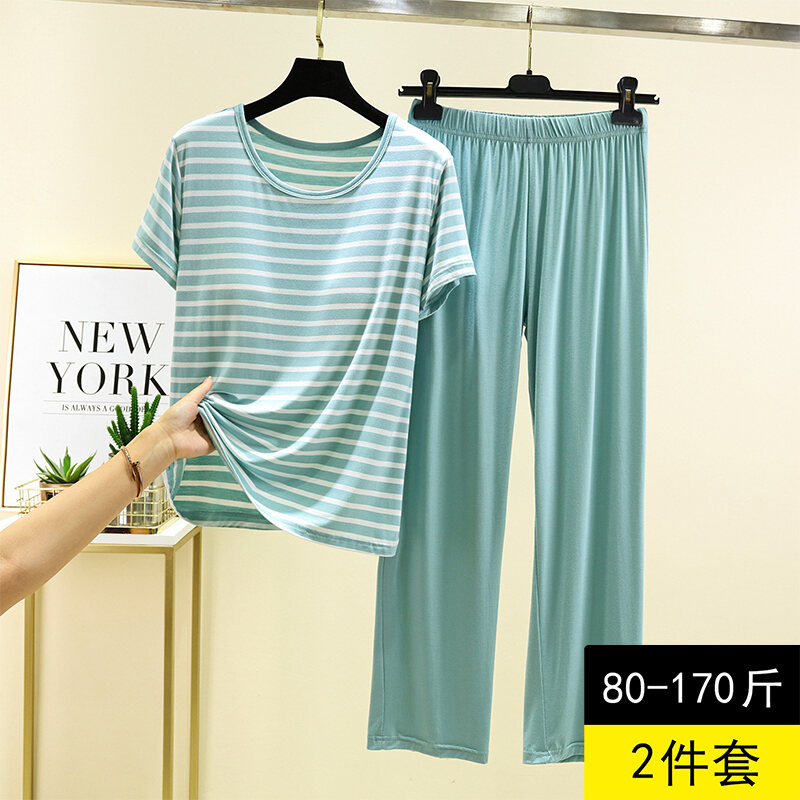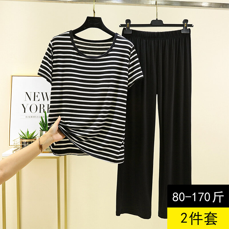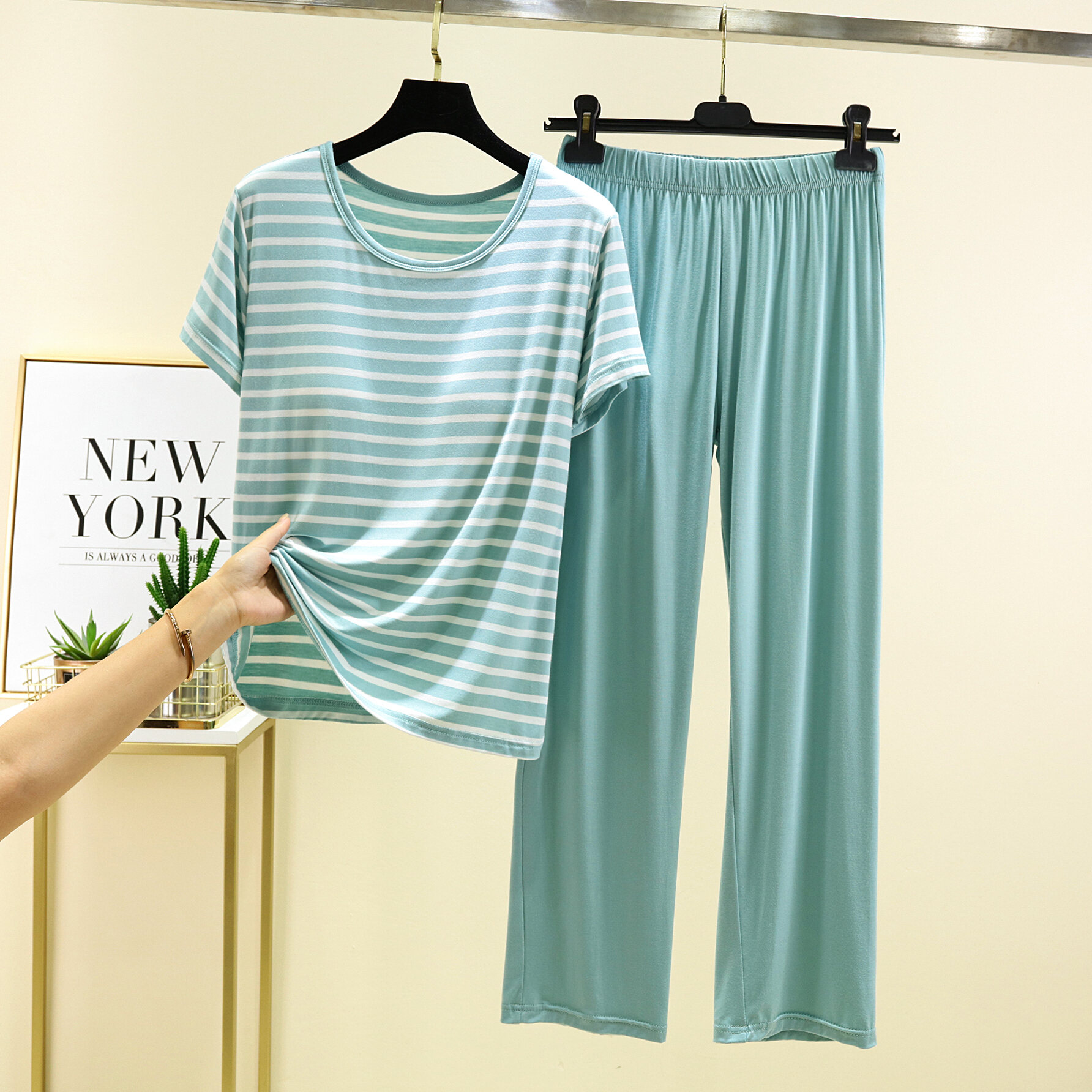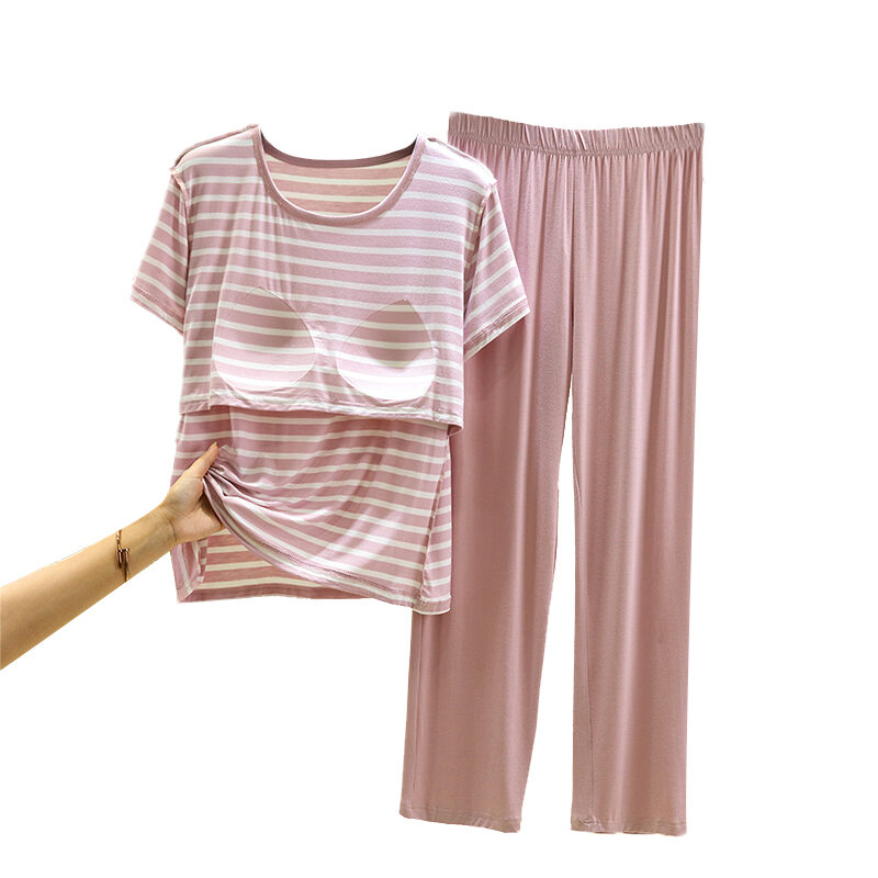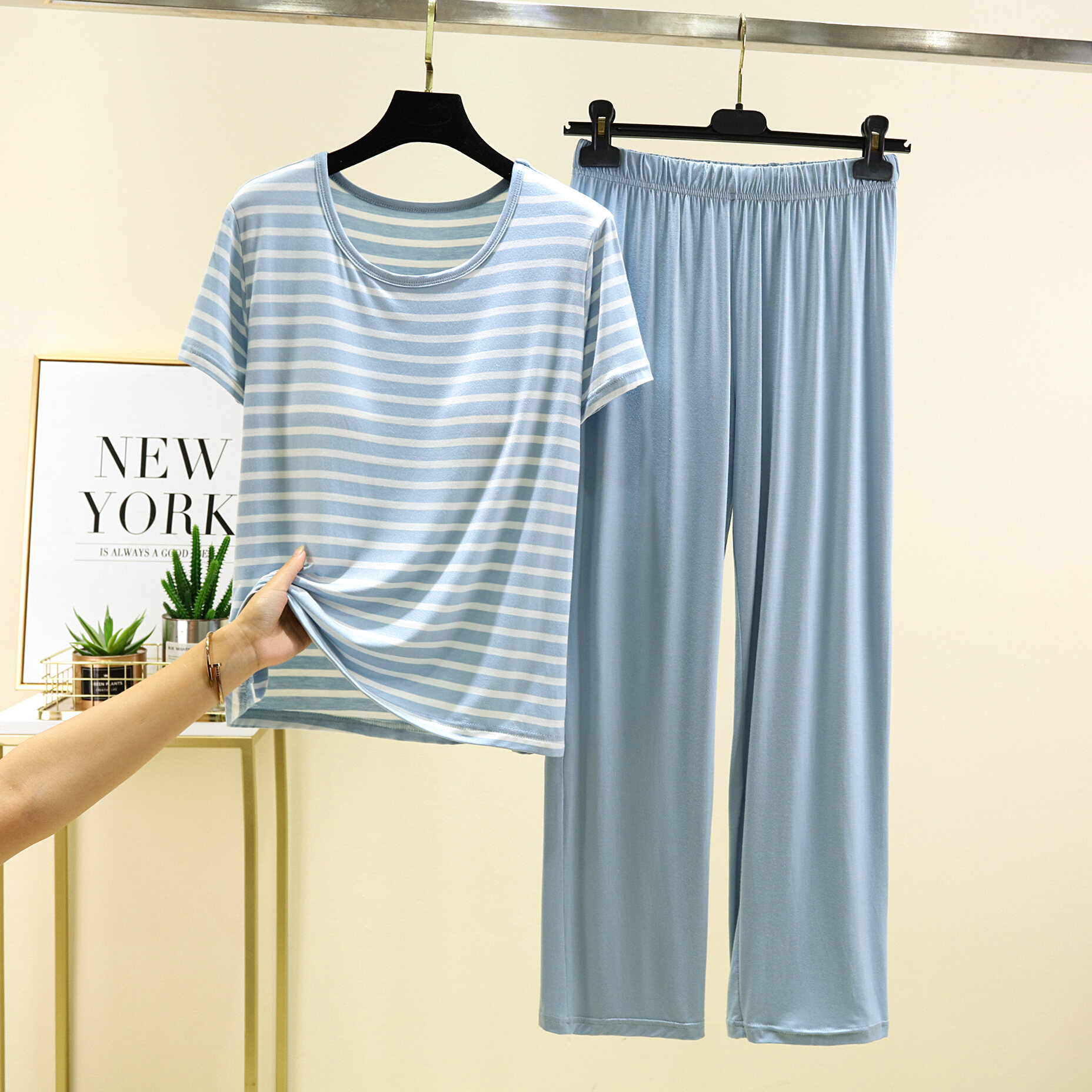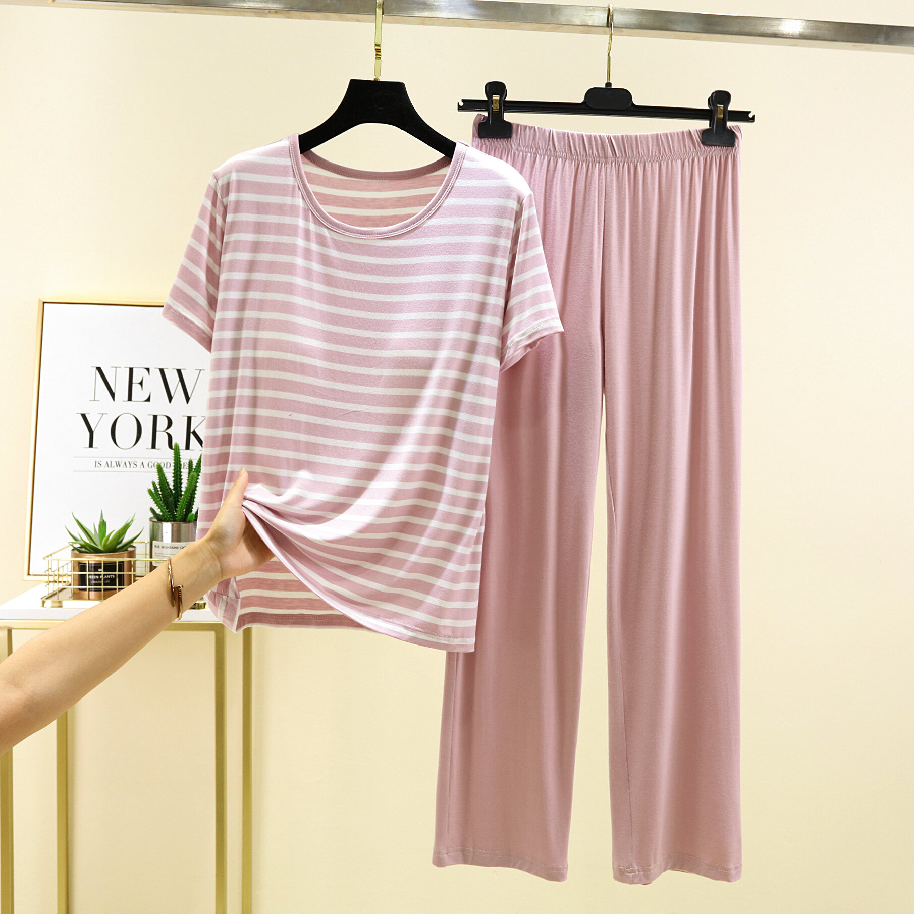 Modal Short-Sleeved Home Wear with Chest Pad Women's Summer Stripes Top and Trousers Two-piece Set Wear-Free Bra Pajamas Suit