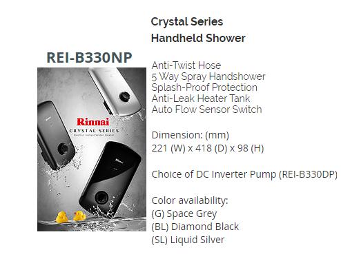 RINNAI REI-B330NP BLACK/GREY/SILVER INSTANT WATER HEATER WITH HANDSHOWER SET