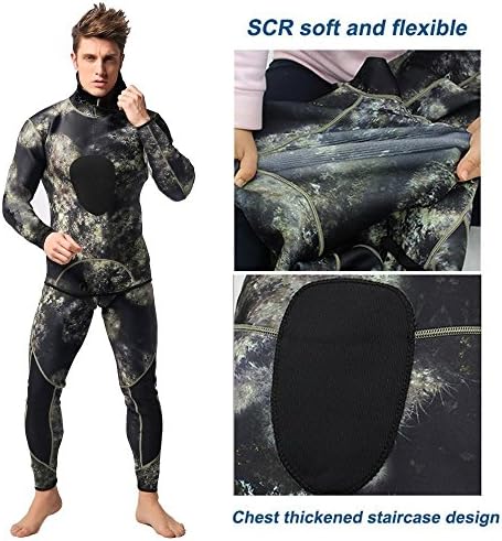 neoprene Import Neoprene: warm, breathable and quick-drying, help to improve the swimming speed and reduce drag of the water. Split Two-piece Design: Wetsuit top with diving hood and wetsuit vest pants as the picture shows, chest and knee pad design, make the diving movement more secure, enjoyable. Warmth and Protection: 3mm neoprene camouflage diving suit provides ample thermal protection and defense against sea lice, jellies and other biological irritants Perfect for all water sports like diving, spearfishing, scuba diving, swimming, surfing, stand-up paddle boarding, wave surfing, kayaking, canoeing, bodyboarding, wakeboarding, windsurfing. WARM TIPS: We have improved the wetsuit size based on customers’ feedbacks, and the size chart is update, please choose the right size according to the size table. Due to the manual measurement, spearfishing Wetsuit size exits ±2cm.