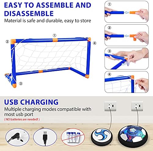 Valuable Hover Hockey Set for Kids: Includes 2 rechargeable hover soccer balls, no need batteries,1 inflatable soccer and 1 inflatable basketball, inflate the ball with the pump,2 hockey sticks, 2 goals and 1 rechargeable cable, a Mini Screwdriver Special Design and Easy to Assemble: The hover ball has multi-color LED lights built in, which can enhance the feeling of fun, This brilliant light can easily grab children's attention and keep them occupied for hours. Multiplayer Game and Enhance the Relationship: Powerful fan floats allow the ball can slide on any flat floor perfectly, including hardwood floors, tile floors, basements, and even low-pile carpets, Kids can not only play with hockey toys but also play them as ice hockey, knee basketball set, soccer hover ball, soccer toys, Kids can also compete with friends and parents to enhance the relationship. Ideal gift: Color packaging, Develop sports skills, collaborative games and social skills, rovide time for enjoyment and exercise for kids.The best choice for children's birthday gifts or Christmas gifts.Suitable indoors or outdoors, perfect for children to enjoy the perfect holiday. ⚽? The hover soccer set for kids allows kids to play in various ways as it glides perfectly on any smooth surface. Kids can play them as hockey toys, soccer hover balls, soccer games, and bowling ball games. In twos or as a multiplayer practice kickback toy with their dog. Excellent soccer games for toddlers 3,4,5,6,7,8 etc