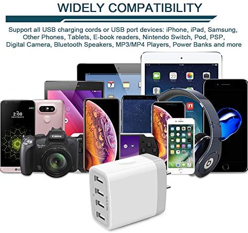 【Premium Performance】4-USB output with a total current 5V/4.8A and input with 100-240V enables you to charge four mobile devices simultaneously at high speed. It can really save your time. 【Safety assurance】AILKIN'S charger block has a protection system against overcharging, over-current and overheating. The charger will automatically stop charging when power is full, which can maximumly protect your device. 【Lightweight】Home charger adapter allows charging at home or in the office via USB cable connection. Simply plug in the USB cable, and plug the adapter into the wall. Compact, lightweight, portable, stylish, and easy to store. 【Multipurpose】Pure white color match all USB cable cords or match your phones. You can share them with your lover, family, or friends. strengthen your relationship. 【What You Get】1 x 4 port USB wall charger. fit for the Latest smartphones or tablets, Like AirPods Pro iPhone 15 Pro Max, 15 Pro, 15, 15 Plus, 14 Pro Max, 14 Pro, 14, SE 3, 13Pro Max, 13, 12, 12 Mini, 12 Pro, 12 Pro Max, SE, 11 Pro Max, XR, XS MAX, XS, X, 8 Plus, iPad Pro, iPad Air, iPad mini. Samsung Galaxy Note 20 Ultra/10 Plus/9 S23 S22 Ultra S21+ S20 S10 5G S10E S9 Plus S8+ A02S A03S A04S A53 A71 A51 A12 A13 A14, Google Pixel 7 Pro 7a 6 Pro 6a 5 4xl 3xl, LG, Kindle Fire HD 10, etc.