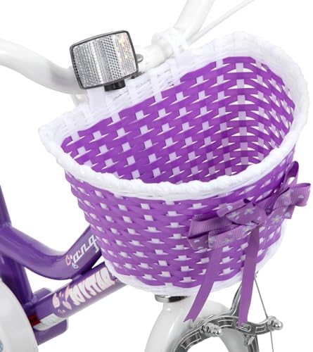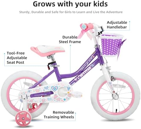 Best Gift for 2-4 Years Old Girls - JOYSTAR Angel 12 Inch Girls bike with bright & stylish colors is suitable for 2 3 4 years old (33-41 inch tall) toddlers. They have adjustable saddle & stem height for easy pedalling. Soft seat offers more comfort in riding. The Angel is perfect for riding to the park or riding on the sidewalk around the neighborhood Bike Designed for Kids - Sturdy Hi-Ten steel frame and fork easily surivive the multiple bumps of learning balance. The amazing ride comes ready to rock with resilient wheels, wrapped in Rubber off-road tires for outstanding grip and stability in any weather conditions. Starter kid bike to help your child learn to balance and pedal while retaining their independence. Safe for Younger Riders - Coaster brake is easy to provide phenomenal stopping power when needed, so they can stay in full control, a great option for young rider. Enclosed chain guard, prevent your kids getting hurt. Removable training wheel will keep everything pointing in the right direction till she's ready to balance on her own. Your Children Will Love It - Singlespeed drivetrain and smaller grip design keep it easy for her to learn and feel comfortable behind the wheels. This girls bicycles come with beautiful basket and DIY Decal stickers adding more fun for your little thrill-seeker to get pedaling up to speed in a flash. Alway on Your Side - As we promise, safety overrides everything. If any issues or concerns arise with our kids bikes, please contact us and we will take an action ASAP. Safety cannot be compromised, it is our PRIORITY. The bike comes with 85% assembled body and the basic assembly tools, timely customer service and also limited lifetime warranty.