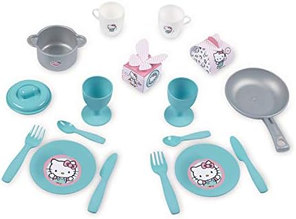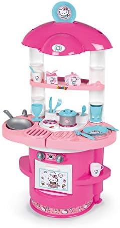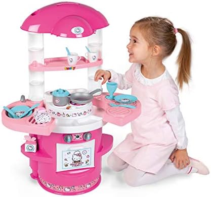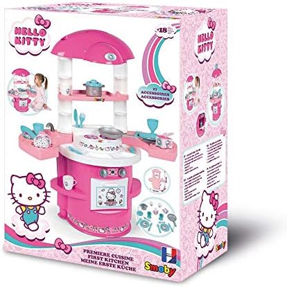Hello Kitty Toy Kitchen Designed in Bright Pink and White Colors and Rounded Shapes, Recommended for Children 3+ Equipped with a cooktop, a sink, an oven, an espresso machine with capsules and storage spaces Countertop has a height of 37.5 cm and includes removable side wings to expand the play area and have additional storage spaces Accessories included: pot with lid, pan, 2 cups, 2 cups, 2 plates, 2 spoons, 2 forks, 2 knives and 2 decorated boxes that simulate food packaging Hello Kitty Line: Toy collection of the well-known white kitten with pink bow, the popular Japanese character who captivates not only children