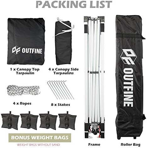 STURDY MATEL FRAME AND TARPAULIN - Canopy metal legs are of 28x28mm, and the top bracket is made of 13x28mm metal. Special thicken metal frame with anti-rust coating. The canopy tarpaulin is made of high density Oxford polyester fiber, with a special silver-plated PU lining, 100% waterproof, UPF 50+, it can block 99% of harmful rays of sunlight. FULL SET OF SUPPORT PARTS - 10 x 10 Ft pop up Canopy Frame, 10 x 10 Ft canopy top tarpaulin, 4 removable oxford cloth side walls, bonus 1 wheeled roller bag, 4 weight bags and 8 tent stakes and 4 ropes. The upgraded style wheeled roller bag is more rugged and durable. EASY TO ASSEMBLE - Only two people are required to easily complete the entire assembly in a few minutes. Take out the canopy frame and top tarpaulin from the bag, place it on ground and unfold it, place the tarpaulin over the frame, then pull it to each corner end fully and extend the legs and it is done. Three different height settings allow you to pick the height which you want, 73inch, 77inch and 81inch. Thumb latch lock system easy to lock and release. SMOOTH PORTABILITY - We bonus a convenient roller bag with heavy duty wheels, which is made of 600D coated PVC fabric, big enough as a storage bag for you to store the canopy when you are not using it. When you go out, you can put it in a vehicle and take it to any place you want. It is very easy to transport. MULTIPLE USE OCCASIONS - The shadow coverage of this canopy is 10 x 10 feet and it can accommodate 4 tables or 7-8 people at the same time. This canopy is suitable for home garden, play ground, yards, farm beaches, commercial area, large gymnasiums, construction area, disaster relief area and more. 4 side tarpaulins are included, 2 with zippers, and 2 with windows, it can be installed or disassembled according to different occasions, which is convenient and practical.