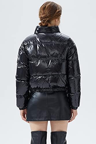 FABRIC: The puffer down coat made by glossy waterproof fabric, shell 100% nylon, lining made by 100% polyester, body/sleeve filler with 90% duck down and 10% feathers,which make this short down coat fashion and warm. FEATURE: The down jacket has ultra-short design, shelling with waterproof bright colors fabric like Red/Purple, which make this coat look more energetic and stylish.In contrast, the black inner lining is soft and skin-friendly. DETAILS: This petite short windproof down coat has plus velvet stand-collar design and branded logo on left sleeve, front with zipper closure, the elastic cuffs and hem make this coat look more puffy, also proviede a better warm effect. STYLE: This shiny short coat is perfect for daily wear, school, vacation, club, dating, party, night out, casual wear and so on. WASH CARE: Hand wash recommended separately with mild detergent and cold water, then drying in the shade, and do not bleach and iron.