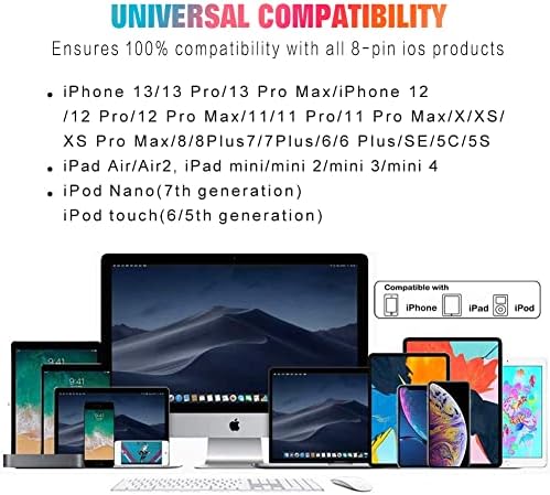 Fast Charge & Data Transfer:Internal high-quality four-core copper wires help to reduce cord resistance,ensure iPhone cable charges 20% faster than other lightning charging cable. Supports maximum 2.4amp current and 480Mbps transfer speeds for your devices in 100% safe case. Durable & Strong -- Tangle-free nylon braided fiber material, strong and wear-resistant, make iphone charger cable more durable, more flexible than standard Phone cable. Reinforced stress points designed to withstand 10000+ cycles of flex test without inner failure. Lightning Cable:For your lightning devices. Built with original chip promise no warning message pops up, ensures that your lightning devices are loaded and charge safely and faster at maximum speed. Universal Compatibility:Compatible with iPhone 14/iphone 13/14pro /13 Pro/iPhone 14pro max /iphone13 Pro Max iPhone 12/iPhone 11 Pro/iPhone 11 Pro Max/XS / Max / XR / X / 8 Plus / 8 / 7 Plus / 7 / 6s Plus / 6s / 6 Plus / 6 / 5s / 5c / 5 / iPad Pro / iPad Air / Air 2 / iPad mini / mini 2 / mini 4 / iPad 4th gen / iPod Touch 5th gen / iPod. What You Get: 3 Pack iPhone charging cables in lengths 10FT, To be convenient to charge your device in bedroom, sofa, office, travel,even when you are on the backseat of the car.If you have any questions, please first times contact us. Our service team will provide you with a satisfactory solution within 24 hours.