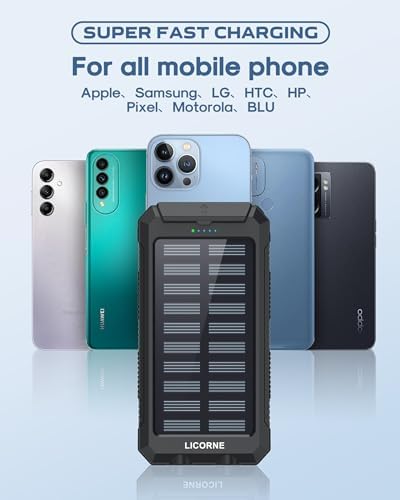 【30000mAh Large Capacity】Built-in industry-leading high-density lithium polymer cells without changing the volume and weight. The super battery life can support thousands of charge cycles. 【66W Fast-Charging Power bank】 The powerful configuration of QC3.0 fast charging 5V3.1A can quickly fill your device. Supports 66W fast charging, save your charging time. 【Dual USB Outport and Powerful LED Light】Makes it easy to charge two smartphones simultaneously or a tablet at full speed. 2 led lights can be used as flashlight. Five pilot indicators show the status of battery charger timely. Green light on when charging by solar, blue light on when USB charging. 【IPX67 Waterproof & Safe Material】 The outer case is made from flame-retardant ABS+PC material. The IPX67 waterproof silicone better protects the internal structure of the charger. comfortable touch, and exquisite appearance. 【Multi-Purpose Outdoor Power Bank】LICORNE portable solar charger is made IPX67 waterproof. The built-in dual super bright flashlight and the included compass carabiner, are the ideal companion for outdoor enthusiasts.