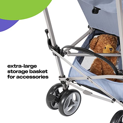 COMPACT AND LIGHTWEIGHT Getting around is easy-breezy with the Cosco Kids Simple Fold Compact Stroller. It’s lightweight, easy to carry, and when you’re done strolling, it folds with one hand and stands on its own. PLENTY OF STORAGE The extra-large storage basket gives parents tons of room to pack up everything they need to haul for a day out with their kiddo. ADDITIONAL FEATURES YOU’LL LOVE Comfy foam-grip handles. Adjustable recline and 5-point harness system. Bumper bar detaches from either side for easy in and out. Holds a child up to 45 lbs. MADE USING RECYCLED MATERIALS This stroller was designed with fabrics made using recycled materials.
