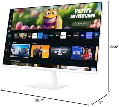 WATCH, PLAY, LIVE IN STYLE: Everything you need is right in your screen - all without connecting a separate PC - with the Smart Monitor; Your favorite content, productivity and video call apps are built in for a simpler and more stylish desktop setup SMART TV EXPERIENCE: Enjoy Netflix, YouTube and other streaming services by simply connecting the monitor to WiFi; Samsung TV Plus also offers free live and on-demand content with no downloads or sign-up needed, while Universal Guide provides personalized content recommendations PC-LESS PRODUCTIVITY: Browse the web, edit documents and work on projects, all without the need for a separate PC; With new Workmode, you can also remotely access another PC, use Microsoft 365 programs and even connect to Samsung mobile devices with Samsung DeX for seamless working SLIMFIT CAMERA: The SlimFit camera with tilt functionality allows you to create the perfect angle while using your favorite video call apps like Google Duo, which can be accessed directly through the monitor; Plus, the camera cover and option to fully detach always protect your privacy IoT HUB: Turn your Smart Monitor into a control center for the home by connecting it to your IoT home products with SmartThings; Turn off lights, pull down blinds and set the thermostat to the perfect temperature all with the Smart Monitor for a perfectly relaxed evening