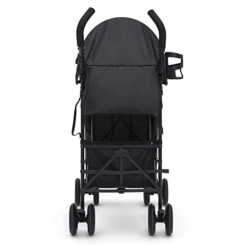 SMOOTHEST RIDE: Swivel front wheels feature precision technology for outstanding control and effortless push | Easier than ever to glide, turn and maneuver any surface | Locking back brakes | Puncture-proof 6-inch tires are durable/shock absorbing LIGHTWEIGHT: The ultimate in convenience, this lightweight stroller has a durable steel frame that only weighs 15 lbs. | Comfortable 43" stroller height is ideal for all parents COMPACT FOLD: The easy compact umbrella fold with carry handle and auto latch lock Is ideal for travel or everyday use | Folded dimensions: 9.5"L x 6.7"W x 41.7"H | Meets theme park size requirements DESIGNED FOR COMFORT: Keep your child comfortable with optimal support in all 3 recline positions | Oversized canopy with extendable sun visor has UPF 50+ protection | Stroller has plenty of storage with its extra-large storage basket and cup holder SAFE OPTION: JPMA certified; meets or exceeds and ASTM and CPSC standards | 5-point safety harness | Reflective shoulder pads | Recommended for ages 9 months up to 50 lbs. | Assembled dimensions: 20.7”W x 31.5”D x 42.9”H