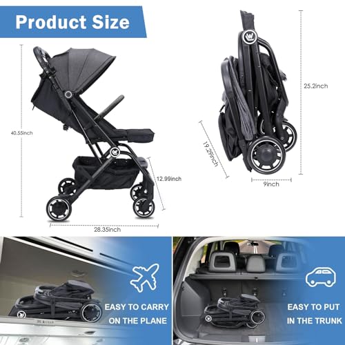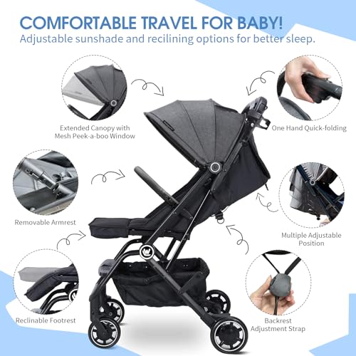 Linen Upgraded Lightweight Stroller - The baby travel stroller backrest is can be adjusted between 100-170 degrees, so your toddler can sitting or lying. Our One-hand fold travel stroller will make outing more easier. travel stroller airplane-friendly lightweight design (only 15.43 lbs). And also has a extra-large canopy and large seat area. You can fold compact stroller it without much effort when you want to store it. One-Second Fold - Deliver a true one-hand, easy fold compact travel stroller. The convenience stroller could stand on its own when folded. Convenient for going out or vacations. Reclining stroller lightweight Folded Dimensions: 19" W x 9" d x 25" h. This compact lightweight stroller makes it simple to store and easy to carry. (With a Cup holder) High Quality - The lightweight travel stroller is constructed with a heavy-duty Aluminum frame, Our compact baby stroller features a 5-point safety harness, which can protect your baby from sliding out of the bassinet. and the maximum weight for this toddler stroller: 50 lbs/22kg. Recommended Age: 0-36 months. Adjustable reclining backrest and canopy - Adjustable seatback with multiple recline positions to let your baby comfortably sitting or lying. And the extended sun canopy provides more sun coverage and sunside protection, lightweight umbrella stroller it also comes with a removable shading cloth that allows the baby to have a dark environment to rest. Multiple Handy Features-Foldable compact stroller is convenient for you to carry items when you go out every day, travel stroller lightweight it could easily storage bottle, toys, diaper bag and other essentials. Peek-a-boo window, lightweight stroller for travel Allow you to keep an eye on your baby at any time. Detachable armrest, allows your baby easily in and out.