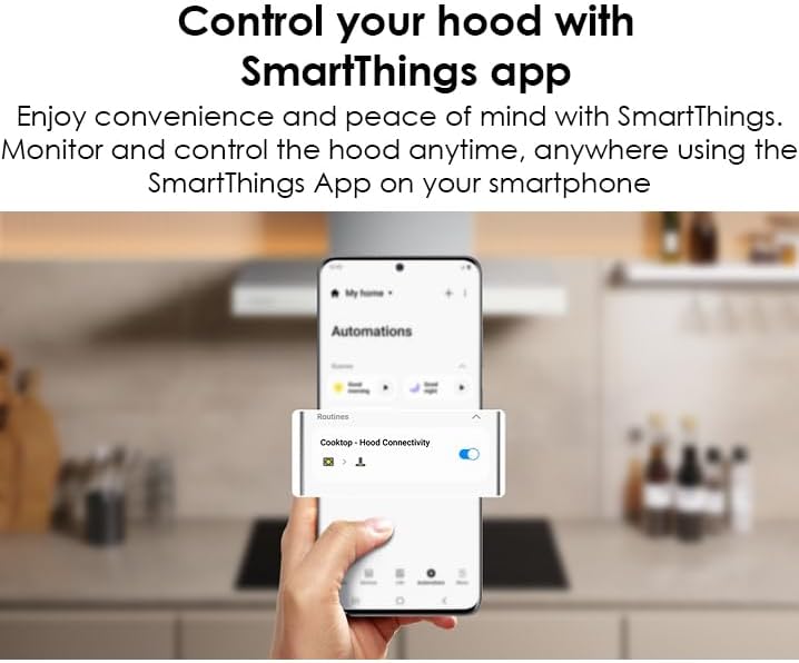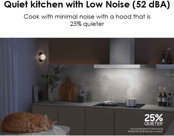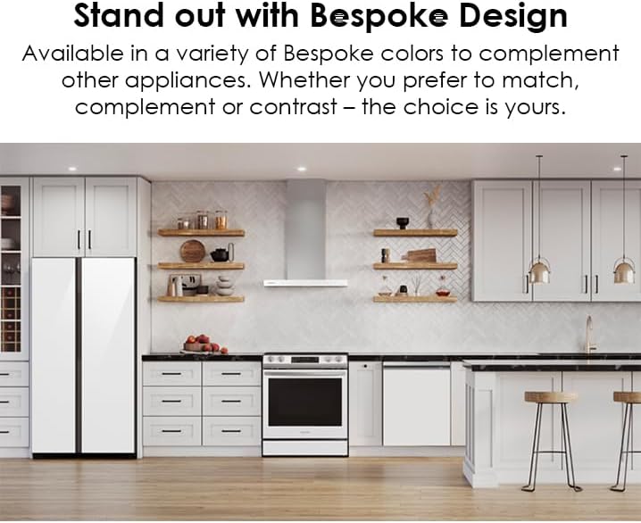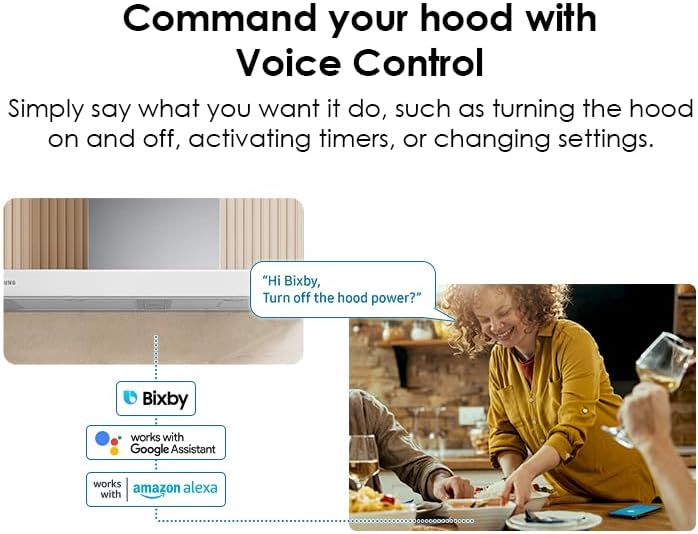 BESPOKE DESIGN: Available in a variety of Bespoke colors¹ to complement other appliances and express your personal style. Whether you prefer to match, complement or contrast – the choice is yours LOW NOISE: Cook with minimal noise with a hood that only reaches 52 dBA WI-FI CONNECTIVITY: Monitor and control the hood anytime, anywhere using the SmartThings App on your smartphone; Automatically turns on once your cooktop burner is powered on VOICE CONTROL: Control your hood by voice when you’re busy doing other things by using your favorite virtual assistant, whether it’s Samsung Bixby, Amazon Alexa or Google Assistant LED LIGHTS & TOUCH CONTROL: Use the touch of your finger to easily adjust settings on the LED display touch controls