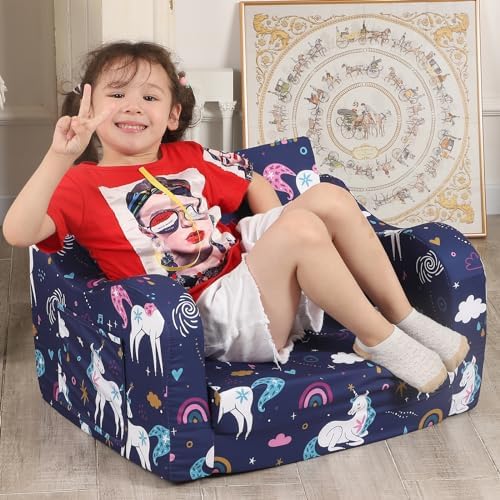 Rainbow Unicorn Printed: Add a touch of charm and enchantment to kids' freedom space with our so-soft kids sofa featuring magical unicorns. Kids Friendly Design: The comfy kids chair is lightweight for kids to move to any room they want, whether its reading, playing video games, watching tv, or just relaxing, children can play with this sofa as they please. Kids Convertible Sofa: The Kids Chairs is perfect for kids sitting and reading or watching their favortie cartoon. During nap time this sofa chair folds out into a comfy nap pad. Toddler Couch Safety and Reliability: The kids sofa chair is made of durable soft polyester that is easy to clean and is filled with premium foam to support kid's body. The sofa is designed with safety in mind, as there are no sharp corners or hard edges.
