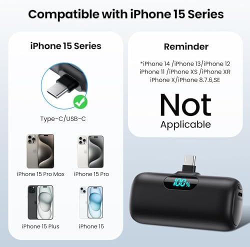 【Portable Charger with the Built-In USB-C Connector】this power bank is widely compatible with iPhone 15/15 Plus/15 Pro/15 Pro Max, iPad Air (4th/5th Gen), iPad Pro 11-in. (1st/2nd/3rd/4th Gen), iPad Pro 12.9-in. (3rd/4th/5th/6th Gen), iPad mini(6th generation), iPad(10th Gen), AirPods Pro(2nd Gen), Samsung Galaxy S22/S23,Google Pixel, LG,Moto and other Android devices with USB C charging port. 【Ultra-Compact Portable Charger】 this mini portable charger size is only 3.2x1.96x1 inch, Super small and lightweight. You can put in your pocket, clutch bag or purse easily. 【PD Fast Recharging and Smart LCD Display】This mini iPhone15 battery pack support PD quick speed charging,fully recharge this mini portable charger about 2-3 hours. Smart LCD display clearly show the remaining battery left. 【5000mAh Emergency Battery Backup Charger 】This power bank is 5000mAh Capacity,normally 0.9 charge for your iPhone 15, Which is very suitable as a backup power supply for daily use,keeping your devices powered up wherever you go. 【What You Will Get】USB-C portable charger x 1, USB-C charging cable x 1, User manual x1. and 2 Years warranty lifetime technical support. Any questions, please kindly contact us anytime. 【Tips for Charging through Phone Case】This portable charger is compatible with phone case thickness less than 4MM. If your phone case thickness is beyond 4MM, the USB-C port can not plug into charging slot, you need to remove your phone case.