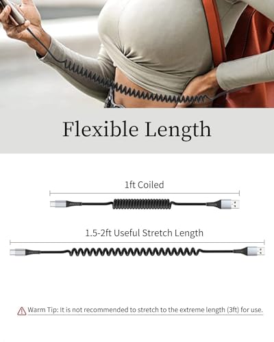 ✅【USB C Cable for Car】The retractable usb c cable is designed with a retractable spring shape, no twisting, no knotting, stretching freely, not taking up space, and easy to carry. Using it in the car can effectively save space and reduce clutter. Perfect for travelling, and the flexible length can cope with a variety of scenarios. ⭐【Flexible Length】The length of coiled usb c car cable in its natural state (unstretched) is 1feet/12inch, the effective stretched length is 1.5 feet-2 feet, suitable for car front seat. ❤️WARM TIPS: The usb type c car charger fast charging cord may be slightly tight on first use, it will be more comfortable to stretch after a few times of use. ✅【Fast Charge & Data Sync】The coiled usb c charger cable fast charging can provide 3A fast charging and 480Mbps data transfer speed. Built-in high purity copper wire ensures faster and more stable charging. ✅【More Durable】Aluminium alloy charging head and elongated tail make the usb c charging cable coiled has 20 times oxidation resistance, 45000+ times bending life, super long service life. ★You will get 12 months after-sale customer service for any quality related issues. ✅【Wide Compatibility】 2 Pack x Coiled USB A to USB C Cable compatible with Android Auto, Apple carplay, iPhone 15/15 Pro/15 Plus/15 Pro Max, iPad Air 4, iPad mini 6, Macbook Pro, Chromebook Pixel, Moto Z8, Moto Z Droid, Galaxy S23 S22 Ultra/S20+ Ultra/S10/S9/S8, Google Pixel 3/3XL/2/2XL, Huawei P20 P30 Pro, Mate 20 10 Pro, 8/9/Mix 2/Mix 3, and other USB-C devices. #539 in