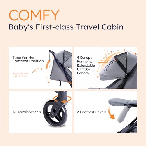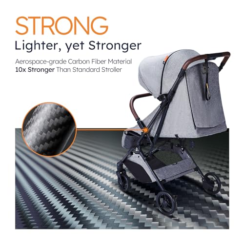 Carbon Fiber Compact & Lightweight Design: Say goodbye to bulky strollers that make travel a hassle. Our baby stroller boasts compact design that effortlessly folds down into a compact size. Weighing in at just 11.5 pounds, thanks to its advanced carbon fiber frame, ensuring a hassle-free experience wherever you go. This innovative material not only provides exceptional durability but also allows for an incredibly lightweight construction, making it a breeze to store in trunks or overhead bins on airplanes. User-Friendly Fold & Unfold: Gone are the days of struggling with complex folding mechanisms. Our lightweight travel stroller features a user-friendly fold-and-unfold system that can be mastered in seconds. This makes transitioning from strolling to storing a seamless process, allowing you to focus on creating memories with your loved ones. Sun Protection and Comfort: Your child's comfort and safety are our top priorities. The Ultra Air Stroller features a UV-protective canopy that shields your little one from harmful sun rays, providing a cool and shaded haven for them to relax in. The adjustable UPF 50+ canopy can be easily positioned to cater to different sun angles, allowing you to create the perfect shady spot as you explore outdoor locales. Ample Storage Space: No need to worry about leaving essentials behind! This compact toddler stroller comes with ample storage options, including a spacious under-seat basket that can easily accommodate diaper bags, toys, snacks, and more. Keep your hands free and your child's necessities within reach as you embark on your adventures. Safety First: We prioritize your child's safety. Our infant stroller features a 5-point harness and foot-operated brake system for maximum security. Suitable for babies aged 6 months up to 50 pounds (maximum height of 39.4 inches). Ultra Air meets or exceeds the highest safety standards set by the CPSC and ASTM.