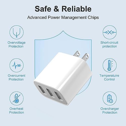 【3-USB Charging Ports】USB wall charger block is designed with 3 USB ports in one cube, allowing you to charge multiple devices simultaneously. Whether you need to charge your smartphone, tablet, smartwatch, or other USB-powered devices, eliminating the need for multiple chargers. 【Universal Compatibility】This is a 3-port USB charging cube that works universally for nearly all devices. The usb wall plug is compatible with iPhone 14/13/12/11 Pro Max, Mini, SE, XR, XS MAX, XS, X, 8 Plus, iPad Pro, iPad Air, iPad mini, Samsung Galaxy and more USB-ported devices. 【Fast Efficient Charging】USB charger block delivers an even output: 2.1A 5V, which ensure a fast and efficient charging to your devices. Not only saves your charging time, but always ensuring that you have a fully charged device. 【Pack of 3 & Portable】You are getting 3pcs USB power adapters, so you can bring one in office, one at home and one for travel. It’s lightweight and compact, which can be easily carried in a bag or pocket, allowing you to take it with you wherever you go. 【Reliable Quality & Safety】The wall chargers with ports are well built for long lasting service. Protecting your devices from overcharging, overheating, and short circuits. Let you rest assured that your devices being charged safely. Any issues during charging, please don’t hesitate to contact us for satisfactory solution.