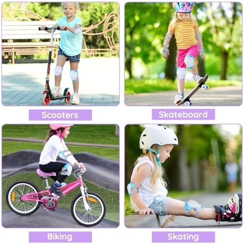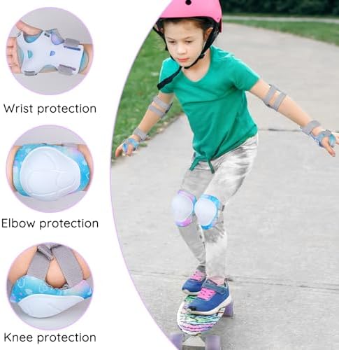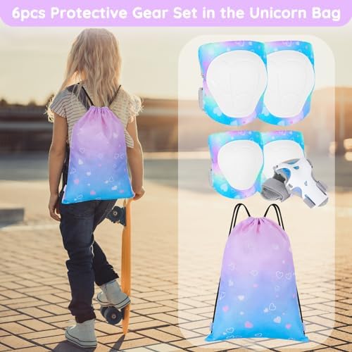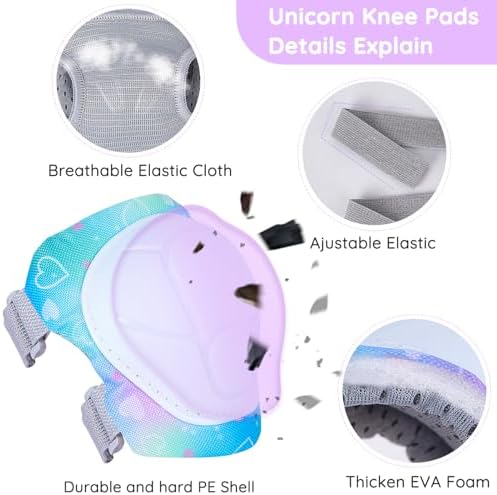 【Package Contains】 This protective gear sets contains 2 x knee pads, 2 x elbow pads, 2 x Wrist Guards, and 1 unique double-shoulder storage package bag. Recommended for children 3-8 years old. It is a perfect gift for Children's Day, Birthday, Christmas,etc. 【Unique Unicorn Pattern】 Kids knee pads and elbow pads set printed with unique unicorn design. Various unicorn position pattern, suitable for girls, especially for unicorn lovers. 【Comfortable And Breathable Material】Skin-friendly and breathable knitted fabric inner layer,ensure smooth-wearing and without feeling sultry. Sturdy and wear-resistant PE shell, provide superior protection for the impact. 【Powerful Protection】Ergonomic structure designed for kids from 3-8 years old, all protective gears fits knee, elbow and wrist perfectly. Tips: the pads would make a little compression to the body allow the body to hold the right position. 【Suitable Sports】This skateboard pads is also great for biking, cycling, skating, scooter, roller blading and other extreme sports.