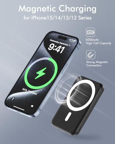 Great Compatibility: This magnetic power bank with the remarkable 5000mAh battery designed for iPhone 15, iPhone 15 Plus, iPhone 15 Pro, iPhone 15 Pro Max, iPhone 14, iPhone 14 Plus, iPhone 14 Pro, iPhone 14 Pro Max, iPhone 13, iPhone 13 mini, iPhone 13 Pro, iPhone 13 Pro Max, iPhone 12, iPhone 12 mini, iPhone 12 Pro, and iPhone 12 Pro Max. (Note: Need to be aligned with the magnetic suction, without cases or with mag-safe cases) Strong Magnetic Wireless Charger: Mag-Safe battery pack with the newest magnetic technology (stronger magnetic and nano adsorption), can directly hold the back of your iPhone 15/14/13/12 Series,providing up to 15W wireless charging. With the mag-safe power bank you can charge your phone anytime and anywhere, without the hassle of wires, perfect for travel, vacation and camping; Extremely Compact Design: This magnetic portable charger iphone fits easily into your pocket, even while wearing skinny jeans. Due to its compact size of 3.74*2.55*0.55 inches, it will not block the camera. The lighter weight(olny 120g) allows you to use it with iPhone gently; Fast Wireless & Wired Charging: Support 5W, 7.5W, 10W and 15W Max wireless charging and max 20W USB-C output; support max 12W Lighting input and max 18w USB-C input; The wireless charger can charge 2 Devices at the same time, shared charging with no waiting. And the portable charger iPhone uses soft silicone material to protect your phone from damage while wireless charging; The magnetic portable charger for iphone ensures faster charging speeds; Superior Safety: With 8 built-in low-temperature ice cores, this latest Podoru magnetic power bank has comprehensive multi protect safety system specifically includes temperature control, overcharge protection, short circuit protection;Multi-Protect safety system ensures that your devices are shielded from potential hazards, providing you with a worry-free charging experience;