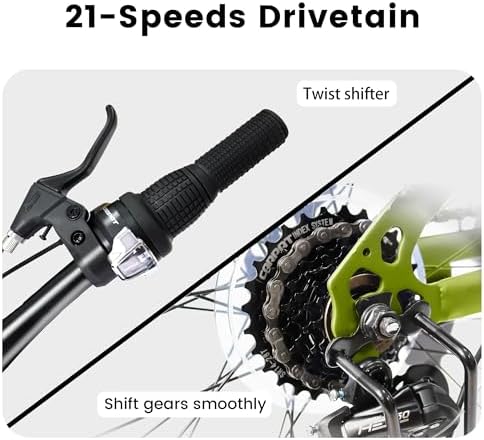 【Durable Steel Frame】Sturdy and durable 24-inch wheel x 15-inch frame, provides a safe and stable cycling experience. Ergonomically designed, suitable for men and women height 5'0"-5'8". 【21-Speed with Disc Brakes】Trigger shifter helps to switch gears with smoothness. Simple operation allows for a quick selection of gears for various terrains. Mechanical dual Disc brake system, simple structure, and convenient for maintenance. 【Front Fork Shock Absorbing Design】Feature 100mm front suspension fork. The thickened fork helps resist and absorb shocks. The parallel bars can adapt to pressure road conditions. Greatly improves the comfort during riding and allows you to enjoy riding. 【24*2.125" All-Terrain Tires】Made of high-quality rubber, all-terrain tires with strong puncture resistance soften the bumps and stick to the Dirt, Trail, Gravel, and Paved Path for a smooth, stable ride: strong grip, have a super excellent anti-skid function and is not easy to slip. 【85% Pre-Assembled】The bike comes 85% pre-assembled. You need to assemble the handlebar, saddle, front wheel, and pedals. After a short adjustment of the brakes and gears, you can start riding immediately. Please note that if you have any questions, you can contact our customer service first.