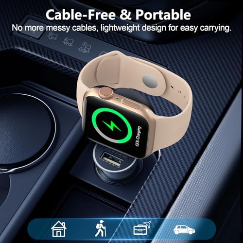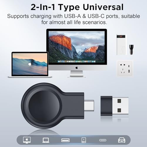 【Widely Compatibility】This upgraded charger designed for Apple Watch (model: Ultra2 Ultra SE2 SE Series 9 8 7 6 5 4 3 2 1, sizes: 49mm 45mm 44mm 42mm 41mm 40mm 38mm) , ensuring convenient charging for all Apple Watch users (ATTENTION: This battery charger is NOT a power bank). 【Two-Way Type Universal】Built-in USB-C interface and equipped with USB-A adapter dual-port design, suitable for almost all types of power ports in daily life, you can plug the charger into power bank/laptop/wall adapter/car or other devices with USB-A or USB-C charging ports to charge the watch. 【Cable-Free & Portable】No more messy cables, saving you from the hassle of winding cables! The compact & lightweight design is slip into pocket or bag easily and convenient to carry around. Perfect ideal for using at home, office, business trips, camping, travels and more daily use scenarios. 【Powerful Magnetic Adsorption】The watch can be adsorption when it touches the charger. The strong magnetism ensures the watch stays in the center of the charger and secures the watch from sliding off, provide a stable charging environment for your Apple Watch. 【Fast & Safe Charging】This portable charger for Apple Watch offers high speed battery charging experience just like original charger, which can fully charged your watch only takes 2~3 hours. And the safety features such as over-current, over-voltage, short-circuit and over-temperature protection protect your iWatch from damage caused by abnormal charging.